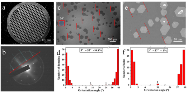 Figure 3. T-Pt基底上生長單晶石墨烯的表征。(a-c)SEM圖和選取衍射圖(ASED)。(d)石墨烯疇的晶體取向統(tǒng)計(jì)圖。(e) 氫氣刻蝕后T-Pt表面上連續(xù)石墨烯的SEM圖像。(d)蝕刻孔邊緣取向統(tǒng)計(jì)圖。