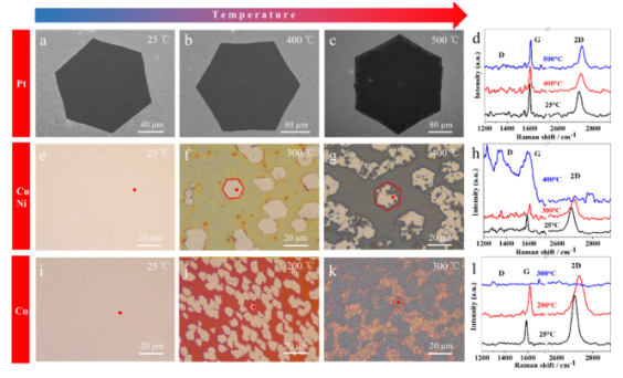 Figure 5. 石墨烯在Pt、CuNi和Cu膜表面的抗氧化性。(a-c)Pt膜上的石墨烯在400°,500°退火10分鐘前后的掃描電鏡圖像。(d)對(duì)應(yīng)的拉曼光譜。(e-g)CuNi膜上的石墨烯在300°,400°退火10分鐘前后的OM圖像。(h)對(duì)應(yīng)的拉曼光譜。(i-k)Cu膜上的石墨烯在200°,300°退火10分鐘前后的OM圖像。(l)對(duì)應(yīng)的拉曼光譜。