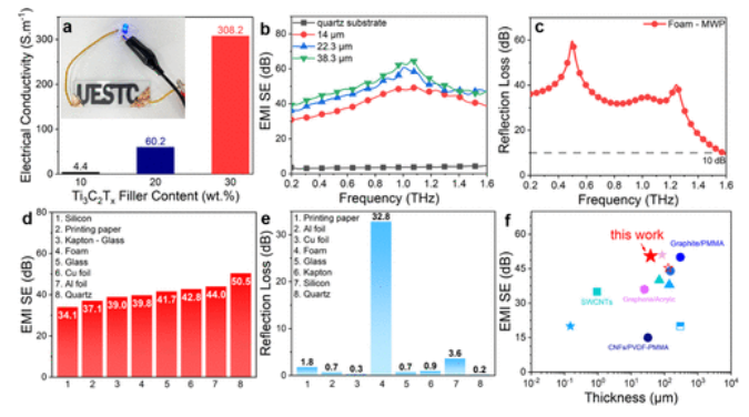 Figure 4 MWP的電導(dǎo)率和30 wt% MWP的太赫茲輻射屏蔽/吸收性能。(a)具有不同Ti