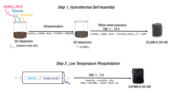 方案1.代表性說明CoP@N,S-3D-GN雜化電催化劑擬議的兩步合理生產(chǎn)途徑。