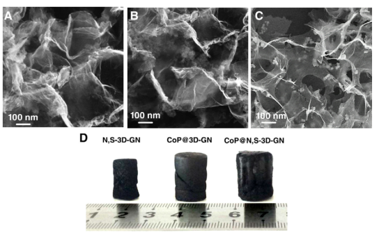圖1:(A)N,S-3D-GN掃描電鏡顯微照片,(B)CoP@3D-GN掃描電鏡顯微照片(C)CoP@N,S-3D-GN掃描電鏡顯微照片(D)電催化劑的數(shù)字圖像。