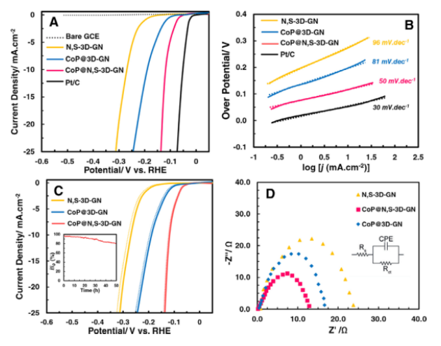 相關(guān)研究成果于2021年由土耳其安塔利亞阿克德尼茲大學(xué)電力與能源系技術(shù)科學(xué)職業(yè)學(xué)院Ceren Karaman等人,發(fā)表在Electrochimica Acta (https://doi.org/10.1016/j.electacta.2021.138262)上。原文:Tailoring of cobalt phosphide anchored nitrogen and sulfur co-doped three dimensional graphene hybrid: Boosted electrocatalytic performance towards hydrogen evolution reaction。