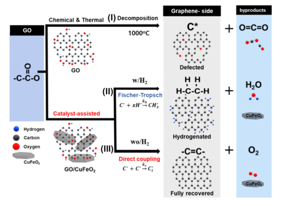 Figure 1. 通過(I)傳統(tǒng)熱/化學(xué)方法還原氧化石墨烯的過程示意圖,以及使用催化劑(II)含氫(Fischer -Tropsch反應(yīng))或(III)不含氫(改進(jìn)的Fischer -Tropsch反應(yīng))的可能機(jī)制。