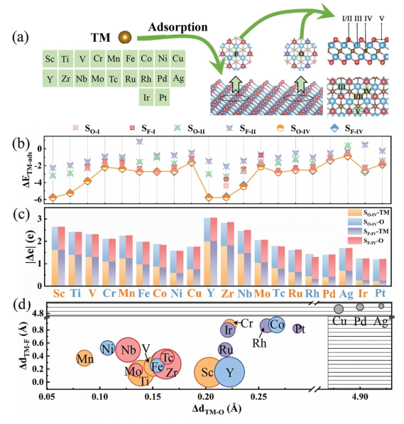 Figure 2.(a)TM吸附位點和吸附單原子類型示意圖,在圖中,不同化學環(huán)境中有兩種類型的原子(F,O),各種具有五個TM吸附位點,即-F或-O空位(S