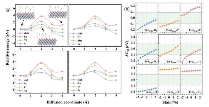 (平板)和經(jīng)Sc、Ti、V、Cr、Mn、Fe、F、Ni、Y、Ru、Rh、Ir和Pt改性后的過渡能壘。b)計算了TMs-Ti