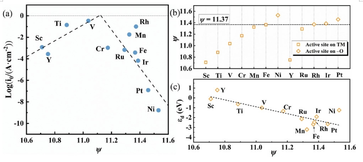 描述符ψ。(c)d帶中心(εd)作為描述符ψ的函數(shù)。