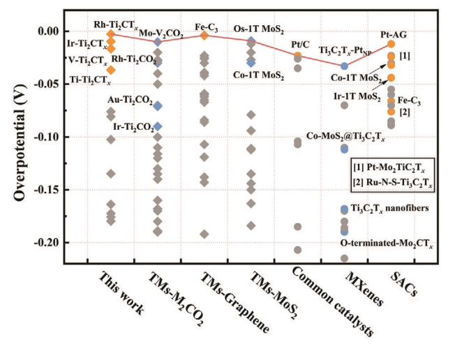 Figure.6(a)一些二維和常見催化劑在仿真和實驗中的HER過電位,菱形和圓形分別代表仿真和實驗數(shù)據(jù)。