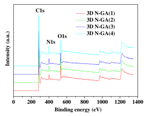 圖4. 3D N-GA(1) 的(a) C1s和(b)N1s XPS光譜;3D N-GA(2) 的(c) C1s和(d)N1s XPS光譜;3D N-GA(3) 的(e) C1s和(f)N1s XPS光譜;3D N-GA(4) 的(g) C1s和(h)N1s XPS光譜