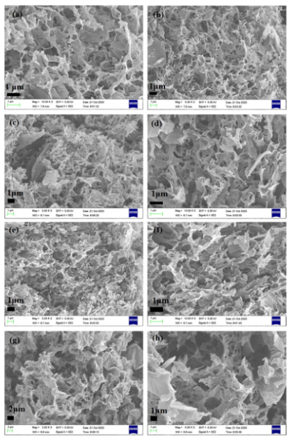 圖5. (a)、(b) 3D N-GA(1)的SEM圖像; (c)、(d) 3D N-GA(2)的SEM圖像;(e)、(f) 3D N-GA(3)的SEM圖像;(g)、(h) 3D N-GA(4)的SEM圖像