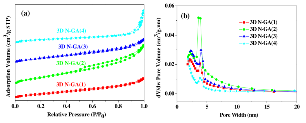 2吸附-解吸等溫線和(b)相應3D N-GA(x)的孔徑分布