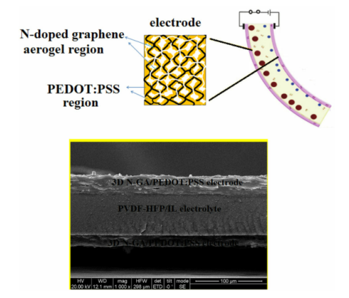 圖7. 三維N-GA電極電活性離子聚合物驅(qū)動器原理圖及截面掃描電鏡圖
