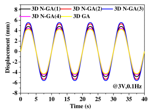 圖9. 不同3D N-GA(3)驅(qū)動器在3v 、0.1 Hz下的電致位移曲線