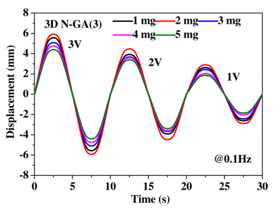 圖10. 不同3D N-GA(3)驅(qū)動器在0.1 Hz不同輸入電壓(1-3 V)下的電致位移