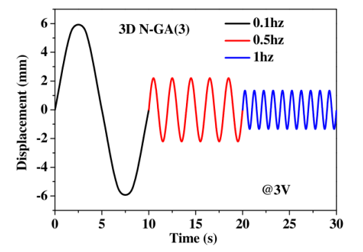圖11. 3D N-GA(3)驅(qū)動器在3V正弦波輸入電壓下不同頻率(0.1-1 Hz)時的電致位移