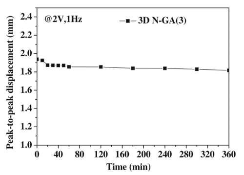 圖13. 3D N-GA(3)驅(qū)動器在2V和1Hz下的峰對峰值的位移耐久性結(jié)果(6h)