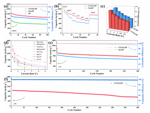 圖5. 不同隔膜電池的電化學(xué)性能。(a)在0.5C時(shí),使用不同隔膜的電池的循環(huán)性能比較;在0.2到5C的電流速率下,使用VN/NG/PP和NG/PP隔膜的電池的(b)速率性能和(c)電勢(shì)差;(d)與其他催化劑進(jìn)行本研究和之前報(bào)告的速率性能比較;在(e)1C時(shí)和(f)2C時(shí) VN/NG/PP電池的循環(huán)性能與NG/PP電池進(jìn)行了比較