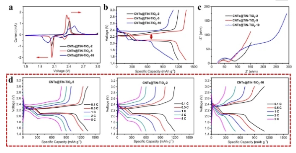 2-10的多硫化物吸附能力;(b-c)CNTs@TiN-TiO