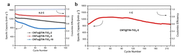 2-10在0.2 C下循環(huán)100次后的循環(huán)穩(wěn)定性比較;(b)CNTs@TiN-TiO