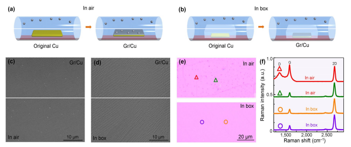 Figure 1. 消除CVD石墨烯中的“孔洞缺陷”。(a)石墨烯在銅箔襯底上生長過程示意圖。(b)石墨烯在耐熱盒子輔助的銅箔襯底上生長過程示意圖。(c)沒有盒子石墨烯生長的代表性SEM圖,表面有很多顆粒。(d)在耐熱盒中石墨烯生長的代表性SEM圖,表面非常干凈均勻。(e)石墨烯在沒有(上面板)和(下面板)盒子的情況下轉移到SiO