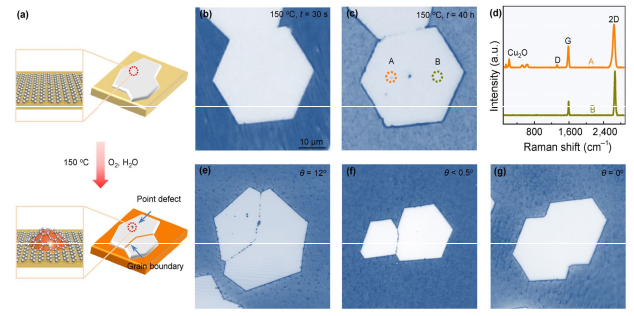 2O特征峰,表明存在缺陷結構和底層銅的氧化。(e)-(g)扭曲角q=12°(e),θ<0.5°和(f)q=0°在烘烤40h后的的兩個合并石墨烯晶疇的光學圖像,即使扭轉角無法區(qū)分,也能清晰地觀察到晶界,這表明我們的方法是識別周期性點缺陷的有效方法。(e)-(g)的圖像大小與(b)相同。