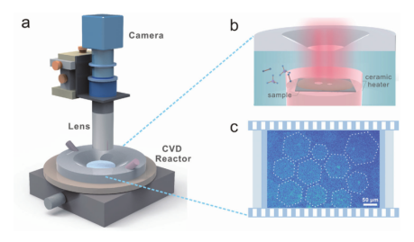 圖1. 石墨烯在液態(tài)銅上的原位生長。a)成像石墨烯生長行為的原位研究系統(tǒng)示意圖;b)在CVD反應(yīng)器中石墨烯單晶生長示意圖;c) 1100°c時獲得的石墨烯在液態(tài)Cu上生長的Rad-OM圖像