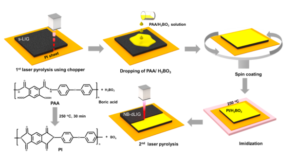 圖1. 制備氮硼共摻雜致密激光誘導石墨烯(NB-dLIG)的示意圖