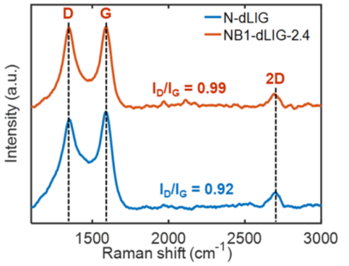 3,然后再進行激光輻照,使N和B雜原子同時致密化并合并到類石墨烯結(jié)構(gòu)的LIG中。優(yōu)化了H