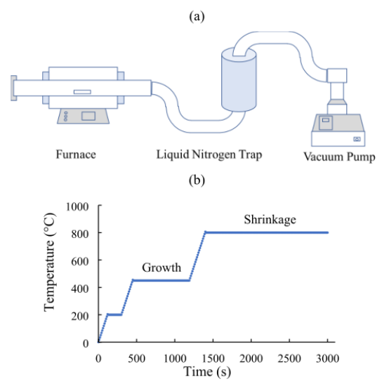 圖 1. 實驗裝置和反應步驟:(a) 在450℃真空爐中用于石墨烯合成的實驗裝置示意圖。 (b) 在TEM顯微鏡下石墨烯原位生長和收縮過程中隨時間的溫度控制。