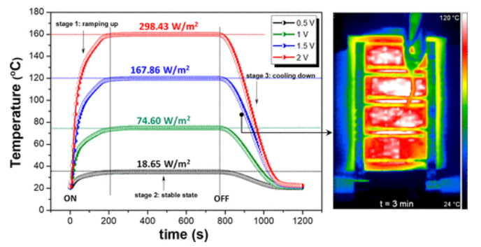 Figure 6.對 GF-SWCNT焦耳加熱器設(shè)備應(yīng)用不同Vbias 輸入(0.5、1.0、1.5和2.0 V)的焦耳熱效應(yīng)的溫度與時(shí)間,顯示每平方米的總功耗(W/m