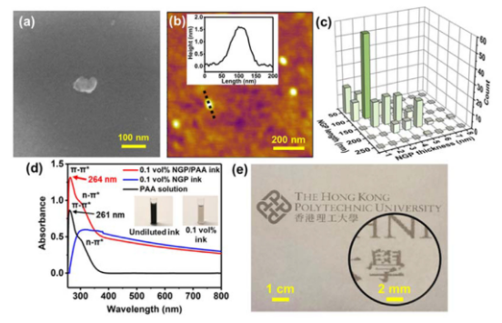 Figure 2. 通過高剪切LPE剝離的NGPs的(a) FESEM和(b) AFM圖像。(c)通過AFM測量的NGP維度的統(tǒng)計結果。(d)NGP/PAA納米復合油墨、NGP油墨和PAA溶液的紫外可見光譜。(e)用NGP/PAA油墨在一張普通紙上印刷的圖案。