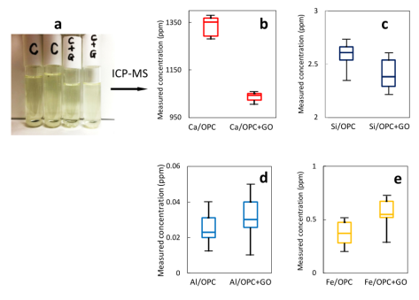 圖8. 在20分鐘時OPC和OPC+GO混合物的ICP-MS元素濃度箱線圖:(a) 提取溶液,(b) Ca,(c) Si,(d) Al,(e) Fe.