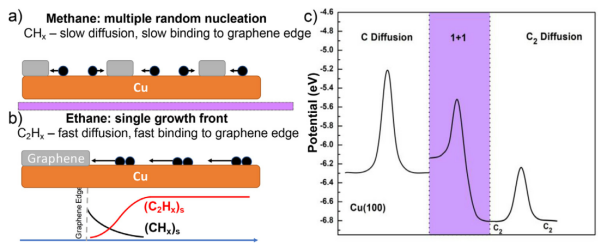 圖2. 說明甲烷(a)和乙烷(b)前體在石墨烯生長中的主要差異:(a)甲烷前體主要產(chǎn)生難移動的CH
