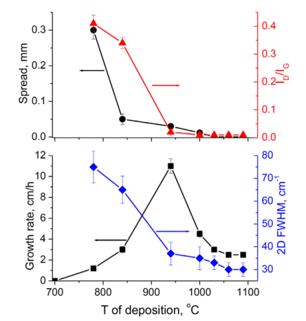 圖3. 石墨烯覆蓋的溫度依賴性,晶種的擴(kuò)散和拉曼數(shù)據(jù)。石墨烯樣品使用60 sccm的C