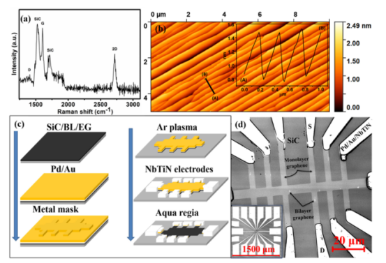 Figure 1. 器件的制造和光學(xué)特性。(a) EG/4H-SiC的拉曼光譜。(b)原子力顯微鏡圖像顯示了碳化硅襯底上乙二醇的均勻表面形貌。(c)無(wú)殘留物器件的制造工藝示意圖。(d)顯示了EG/4H-SiC基器件的共焦顯微圖像。