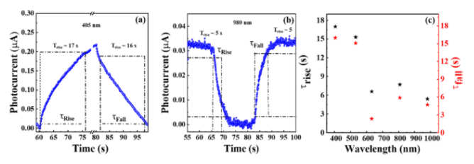 Figure 4.(a) 405 nm和(b) 980 nm激發(fā)下的響應(yīng)時(shí)間。(c) 在1 V外加偏壓下(功率密度為7.96 mW/cm2),呈現(xiàn)了波長(zhǎng)相關(guān)的響應(yīng)時(shí)間(左軸)和恢復(fù)時(shí)間(左軸)。