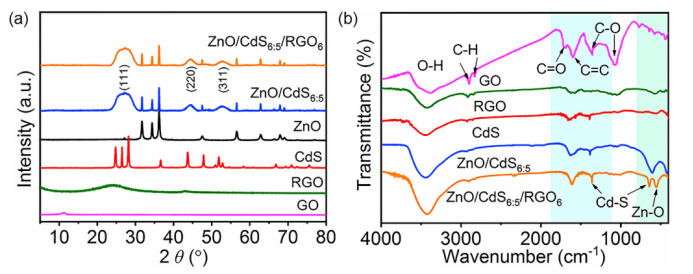 6復(fù)合材料粉末XRD譜圖。(b) GO、RGO、CdS、ZnO/CdS