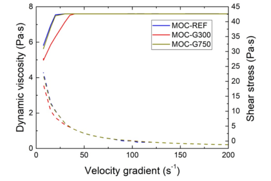 圖3. 新型復(fù)合材料MOC-REF、MOC-G300和MOC-G750的動(dòng)態(tài)粘度和剪切應(yīng)力。