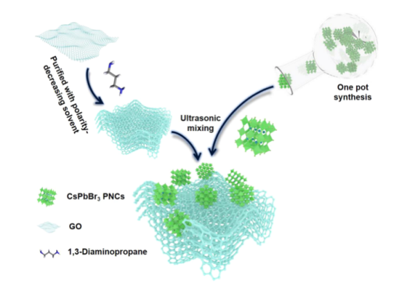 3 PNCs固定在氨基功能化的氧化石墨烯(GO)上,可以制備豐富的三相界面,穩(wěn)定PNCs結(jié)構(gòu)并提供載體轉(zhuǎn)移途徑。因此,GO輔助的CsPbBr