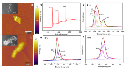 Figure 2. (a) GO和(b) NCM的AFM形貌圖。插圖顯示了相應(yīng)的SEM圖像。(c)−(f) NCM的XPS數(shù)據(jù):(c)寬譜,(d) c 1s譜,(e) O 1s譜,(f) N 1s譜。