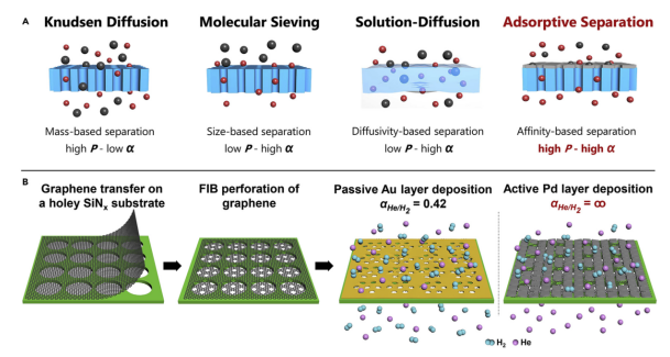 圖1. 使用傳統(tǒng)的膜的氣體分離機(jī)制和親和基分離吸附膜的制造。(A)膜氣體分離機(jī)制(左到右): Knudsen擴(kuò)散發(fā)生在膜孔等于或小于氣體的平均自由程并且選擇性被限制在組分質(zhì)量比的平方根時(shí)。當(dāng)孔隙小到只能讓混合物中的一種成分通過時(shí),就會(huì)發(fā)生分子篩分;然而,由于孔徑很小,滲透率很低。當(dāng)膜中組分的溶解度不同時(shí),就會(huì)發(fā)生溶液擴(kuò)散,由于擴(kuò)散率的不同而發(fā)生分離;然而,由于膜結(jié)構(gòu)致密,滲透性通常較低。當(dāng)氣體混合物中的一種組分被選擇性地保留而不損失滲透性時(shí),就會(huì)發(fā)生吸附分離。(B)超高滲透和無限選擇性催化膜的制備順序。首先,將石墨烯轉(zhuǎn)移到多孔的 SiN