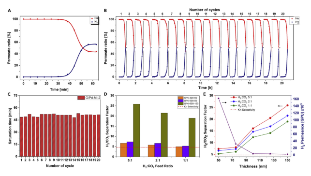He/H2 =0.71)。(B)用循環(huán)20次以上的G/Pd-MI-2膜對(duì)He/H