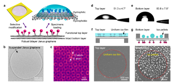 圖1 具有不對稱潤濕性的超凈雙層Janus石墨烯膜。(a)雙層Janus石墨烯膜示意圖。 (b)懸浮雙層Janus石墨烯的代表性TEM顯微圖 (c)雙分子層Janus石墨烯氧對構(gòu)型的原子分辨率STEM圖像。(d, e)典型的光學(xué)圖像揭示Janus的親水表層石墨烯網(wǎng)格與水接觸角為51.3 (d)和疏水底層水接觸角為83.8 (e)。(f)均勻的冰膜表層的雙層Janus石墨烯示意圖。(g)雙層Janus石墨烯底層的非均勻冰珠示意圖。