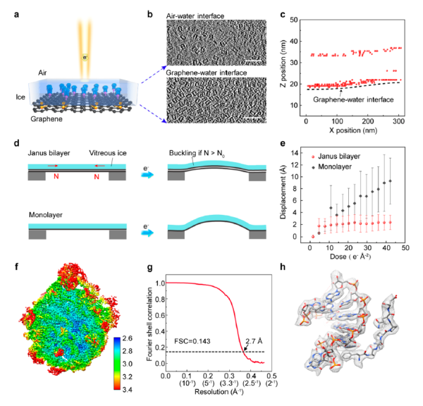 圖4 雙分子層Janus膜用于高分辨率低溫電鏡結(jié)構(gòu)測定。(a)在石墨烯水界面吸附的生物大分子示意圖(藍色)。(b)蛋白酶體顆粒在空氣-水界面(上行)和石墨烯水界面(下行)的代表性冷凍電鏡切片。(c)玻璃化冰中20S蛋白酶體顆粒的空間分布。 (d)雙分子層Janus和單分子層石墨烯上冰膜的屈曲示意圖。 (e)電子束輻射下雙分子層Janus和單層石墨烯上的粒子運動。 (f)重建的50S核糖體的總密度 (g) 50S核糖體重建的傅立葉殼層相關(guān)(FSC)圖。 (h)選擇與相應(yīng)原子模型對接的密度區(qū)域。