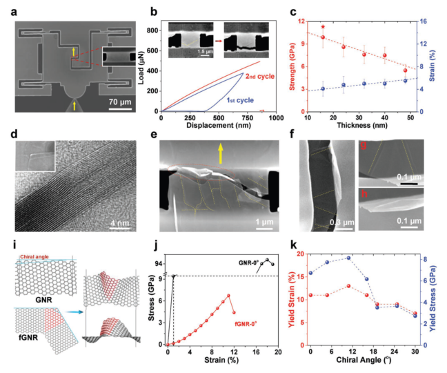 圖3 (a)基于推拉式微器件的nMAGs原位掃描電鏡拉伸測(cè)試裝置,由定量納米壓頭驅(qū)動(dòng)。(b)位移速率恒定為10 nm s的單軸拉伸下16 nm nMAG的載荷位移曲線。(c)不同厚度nMAGs的強(qiáng)度和應(yīng)變。(d)微褶皺HRTEM和SEM圖像。(e)破碎的48nm nMAG的SEM圖像, (f)在48 nm nMAG中提取的石墨烯薄片的SEM圖像。(i)不同手性角度的平面石墨烯納米帶(GNR)和折疊石墨烯納米帶(fGNR)模型。(j)手性角為0(扶手邊)時(shí)GNR和fGNR的應(yīng)力應(yīng)變曲線。(k)可變手性角fGNR的屈服應(yīng)變和應(yīng)力。