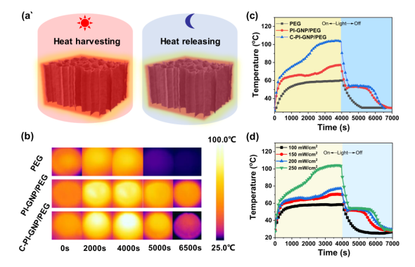 圖6. (a)C-PI-GNP/PEG在白天和夜間的熱量收集和釋放過程示意圖;在太陽模擬器輻射(250mW cm