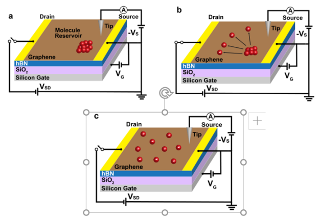 圖 1. 控制石墨烯場效應(yīng)晶體管 (FET) 上的分子濃度。 (a)表示在熱蒸發(fā)到石墨烯 FET 后處于“生長”狀態(tài)的 F4TCNQ 分子構(gòu)型(紅球)的草圖。代表性電路顯示了施加到器件上的偏置。 (b) 向 FET 施加 VG=VG-set 的背柵電壓,同時流過石墨烯的源極-漏極電流 ISD 導(dǎo)致分子擴散到石墨烯表面。VG-set 的典型值范圍為 -60 至 60 V。VSD 的典型值用于將分子濃度范圍從 2 更改為 6 V,典型的 ISD 值范圍為 0.5 至 2 mA。 (c) 當源漏電流關(guān)閉時,器件冷卻,分子凍結(jié)在原地。 然后柵極電壓 VGis 返回到 0 V,然后可以使用 VS = 2 V 的樣本偏置(相對于尖端)和 2 pA 的電流設(shè)置點來穩(wěn)定掃描分子。