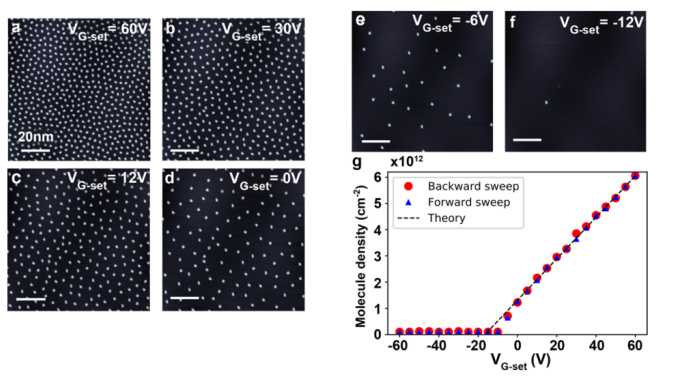 在真空下沉積在干凈表面上吸附物的空間排列通常不能可逆地調(diào)整。 在這里,我們使用掃描隧道顯微鏡來證明沉積在石墨烯場效應(yīng)晶體管 (FET) 上的分子表現(xiàn)出可逆的、電可調(diào)的表面濃度。 在 T = 4.5K 的石墨烯 FET 上實現(xiàn)了對帶電 F