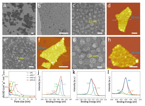 圖2. s-2D mPG異質(zhì)結(jié)構(gòu)表征。mPG-12納米片的(a)SEM圖像、(b,c)TEM和HRTEM圖像、(d)AFM圖像和相應(yīng)的厚度分析。mPG-7納米片的(e)HRTEM圖像、(f)AFM圖像和相應(yīng)的厚度分析。mPG-22納米片的(g)HRTEM圖像、(h)AFM圖像和相應(yīng)的厚度分析。(i)mPG-7、mPG-12、mPG-22和nPG納米片的孔徑分布曲線。(j–l)mPG-12納米片的高分辨率XPS光譜:(j)C 1 s、(k)O 1 s和(l)N 1 s。比例尺:a 1μm、b 200 nm、c,e,g 20 nm和d,f,h 500 nm。