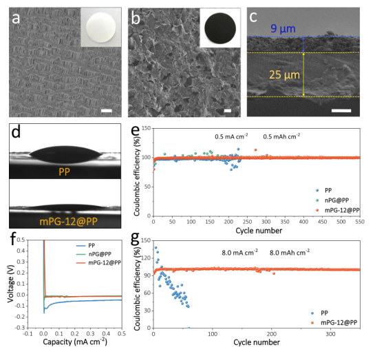 -2時(shí)測量含mPG-12@PP和PP分離器的Na||Cu電池的庫侖效率。比例尺:a、b 1μm和c 10μm。