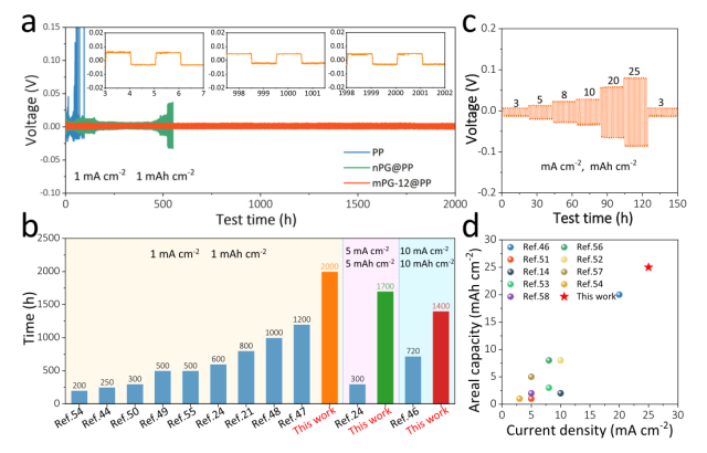 -2時(shí)含有mPG-12@PP, nPG@PP,和PP分離器的Na||Na電池的電壓-時(shí)間曲線(插圖:分別在5、1000和2000小時(shí)時(shí)帶有mPG-12@PP的Na||Na電池的放大電壓剖面圖)。(b) 在相同的電流密度和容量下,含有mPG-12@PP 分離器的Na||Na電池,與先前報(bào)道的通過各種方法穩(wěn)定的那些Na陽極的循環(huán)穩(wěn)定性比較。(c) 分別在不同電流密度和容量下,獲得的具有mPG-12@PP分離器的Na||Na電池的倍率性能。(d) 含有mPG-12@PP分離器的Na||Na電池和最近報(bào)道的其他工作的倍率性能比較。